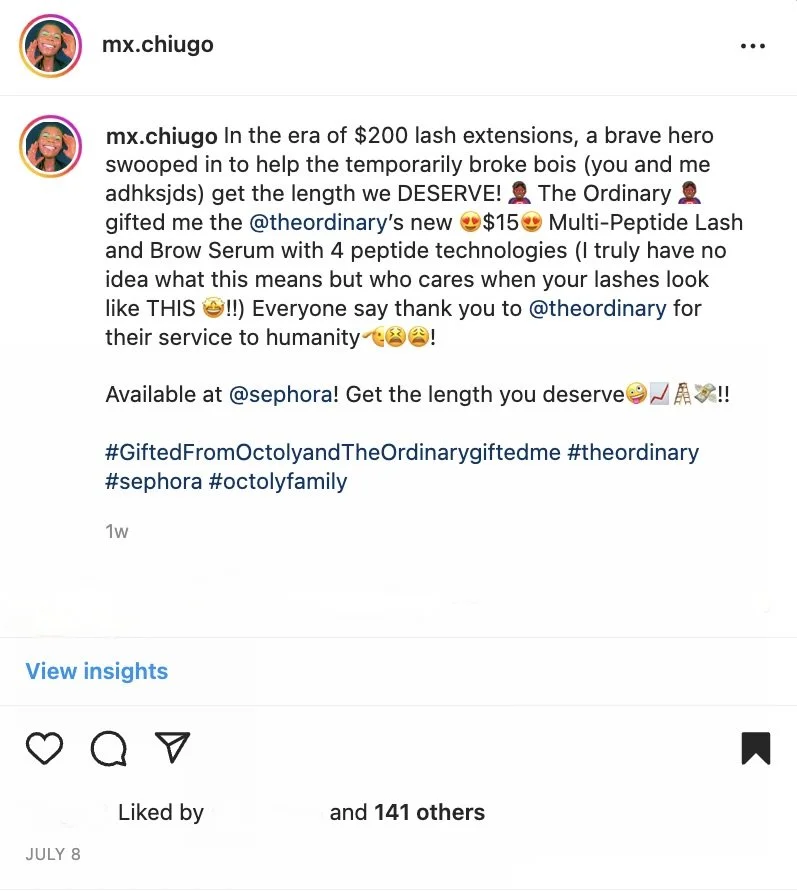 The Ordinary entered the lash and brow serum market, extending their The Ordinary Peptide offerings, seeking consumers without the resources to buy existing lash and brow serums found in the beauty market. They needed a content creator with the ability to relate to their target audience. The skincare brand called for copy to include @theordinary, @sephora, #theordinary, and #sephora with a notice that The Ordinary Multi-Peptide Lash and Brow Serum awaits customers at Sephora. Along with these guidelines, The Ordinary needed content to share that the product has 4 peptide technologies in the formula and comes at a great price point compared to other non-The-Ordinary lash services/products.